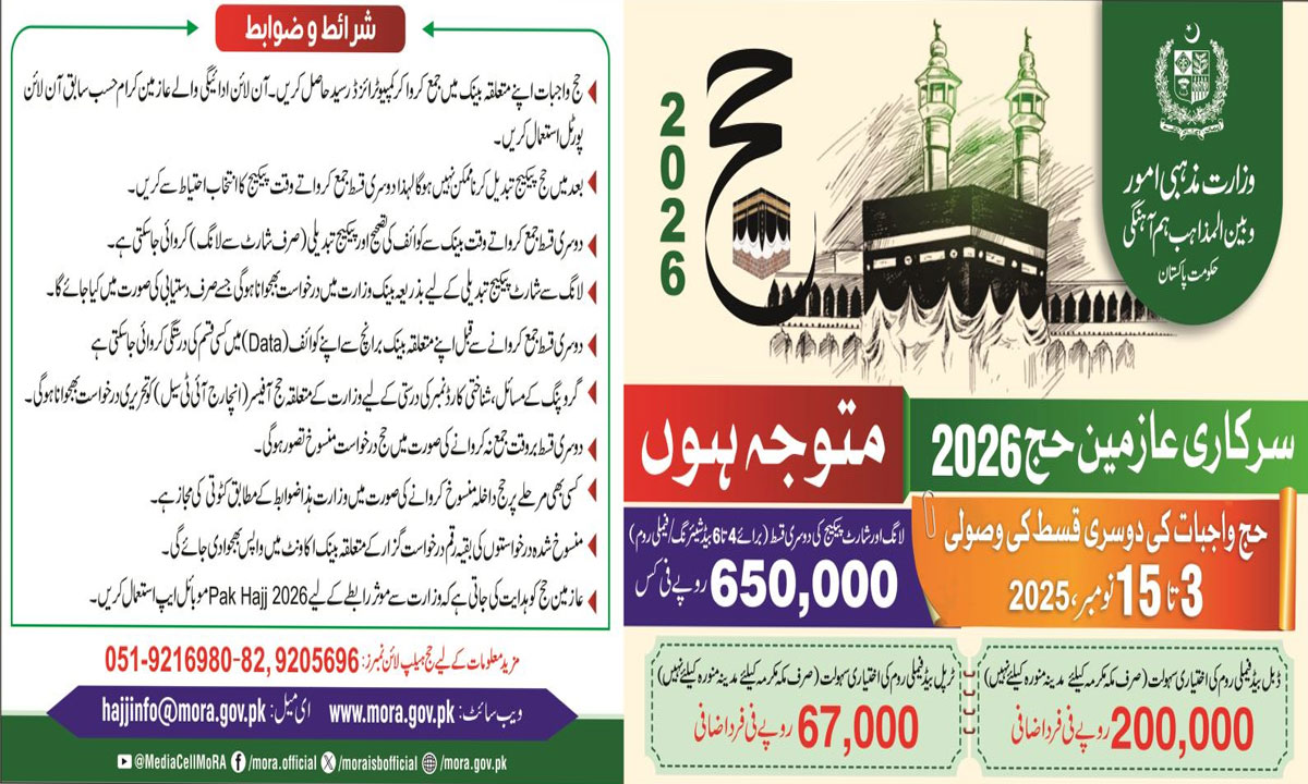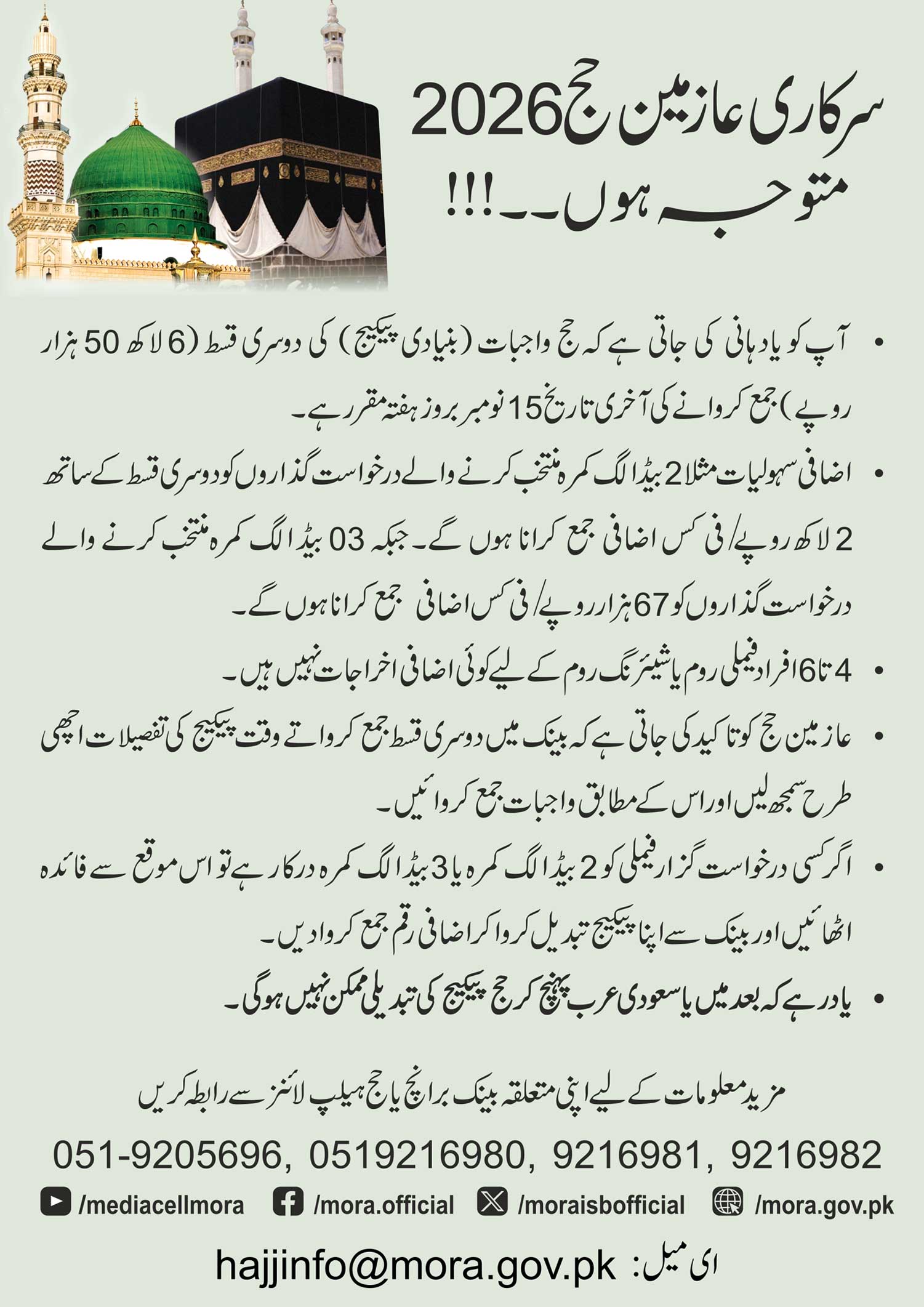 The last date to submit the second installment for the 2026 government Hajj scheme was November 15, 2026