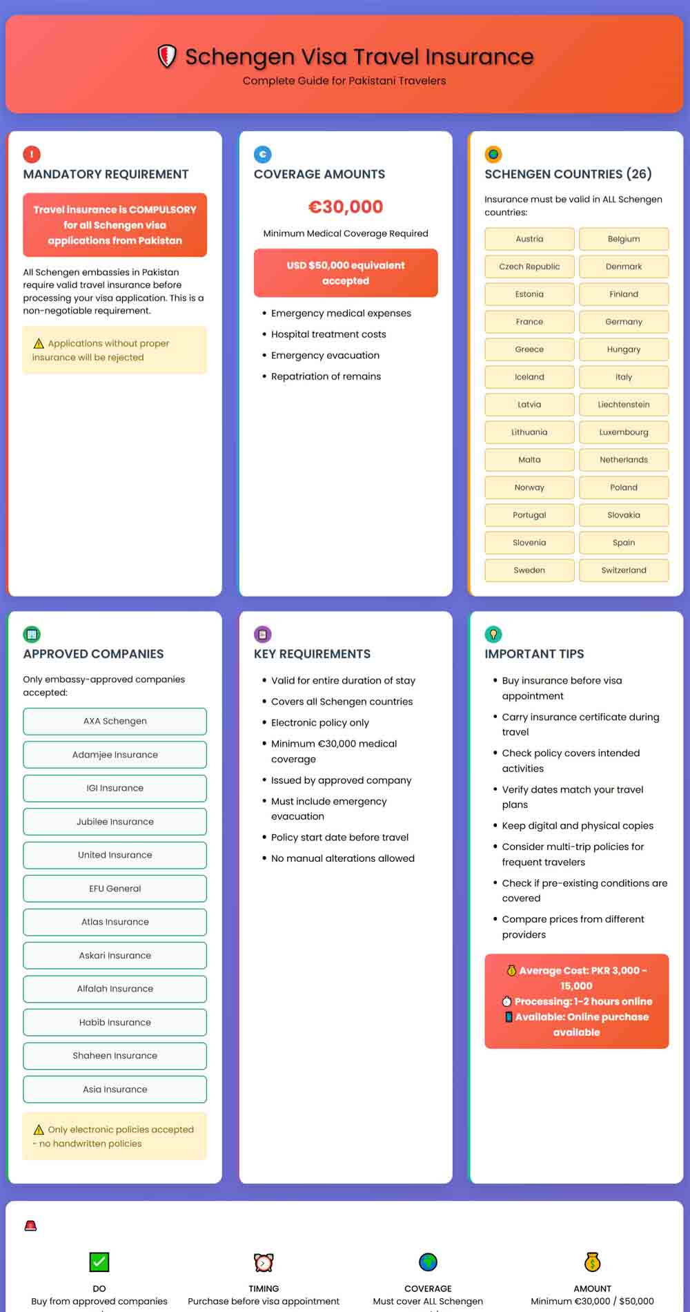 Italy, with its rich history, magnificent art, and delicious cuisine, is a captivating destination that attracts travelers from every corner of the globe. As Italy falls under the Schengen area, which means Pakistani visitors can explore Italy with the help of a Schengen visa. Travel insurance for a Schengen visa is really necessary for tourists because it stands as a crucial safeguard that offers essential medical support and assistance throughout their journey. With Schengen Visa insurance with them, travelers can savor various delightful experiences of Italy with a sense of security, knowing they are prepared for any potential emergencies. For queries related to Schengen visa and its travel insurance, Pakistani travelers can contact the Italian Embassy in Islamabad. Also following are some trusted companies in Pakistan offering travel insurance for Schengen visas: