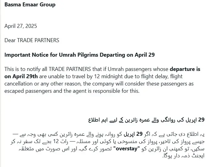All pilgrims under Umrah packages departing on April 29, 2025, must make their travel arrangements accordingly and leave Saudi Arabia before midnight to avoid heavy penalties and legal issues.