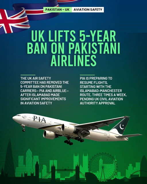 In a major breakthrough for Pakistan’s aviation sector, the United Kingdom has lifted its five-year ban on PIA flights to UK, paving the way for Pakistan International Airlines to once again operate direct services to British destinations.