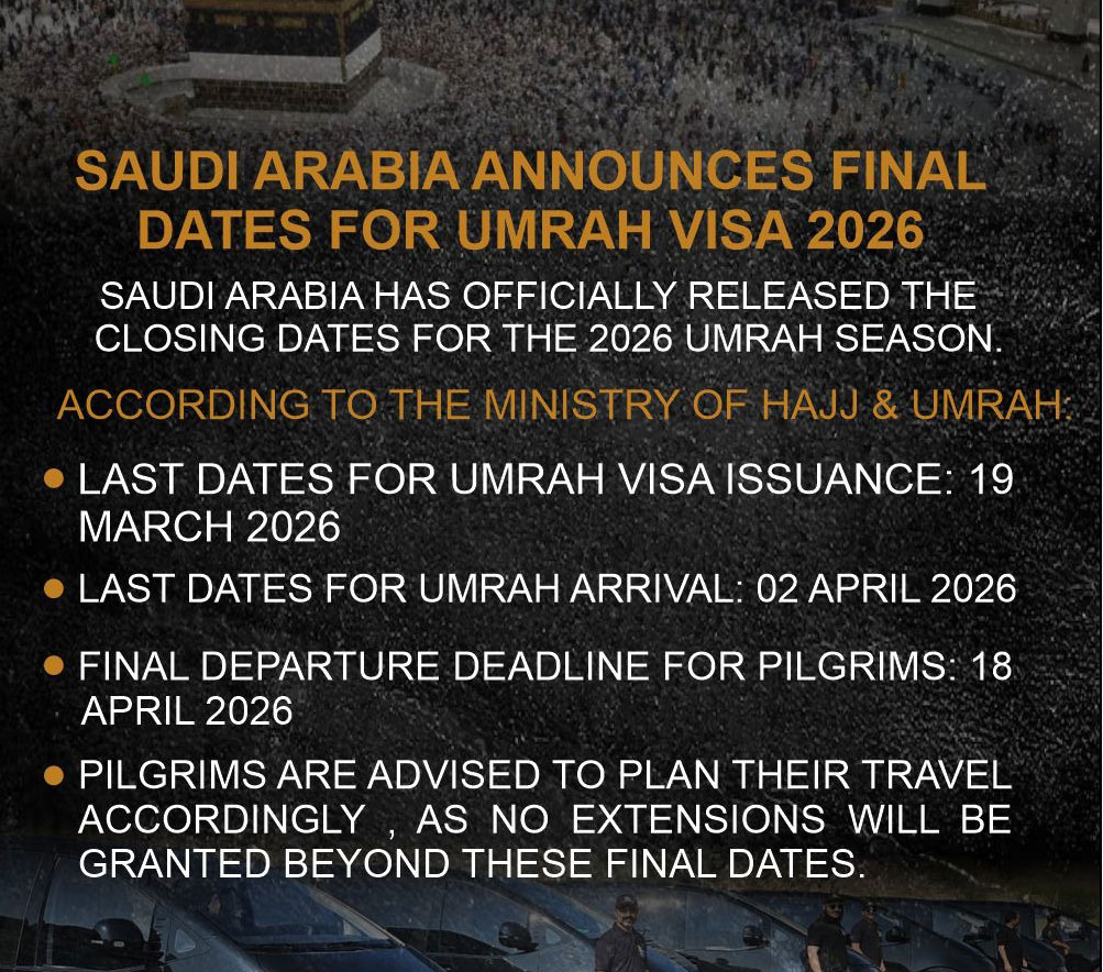 Saudi Arabia has officially announced the final dates for Umrah visa issuance and travel for the 2026 Umrah season. According to the Ministry of Hajj & Umrah, pilgrims planning their spiritual journey must complete their travel within the announced deadlines, as no extensions will be granted beyond these dates.