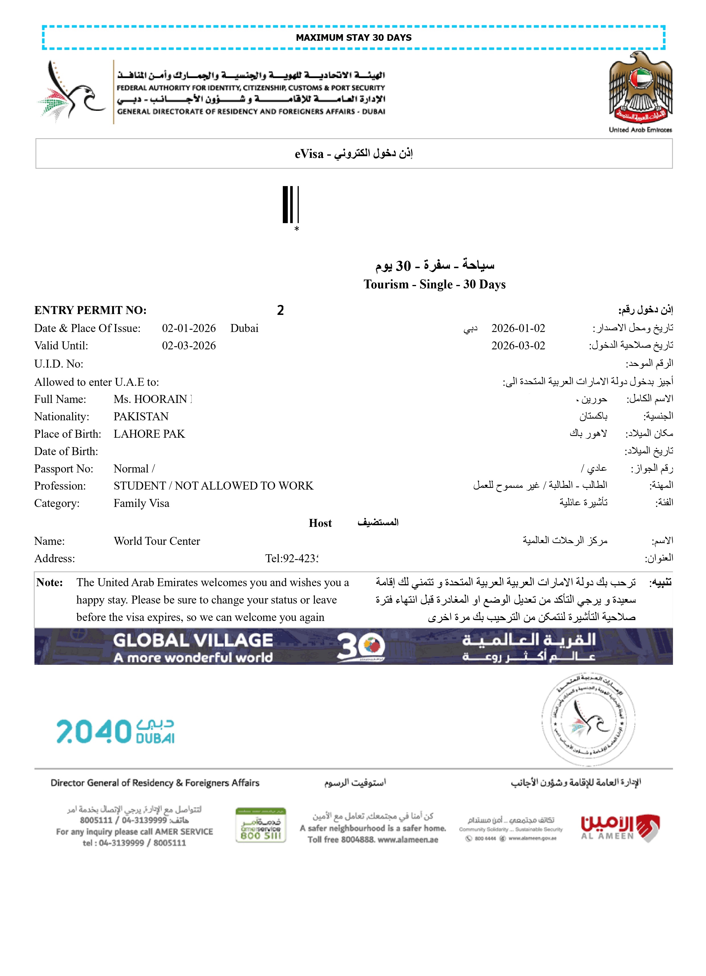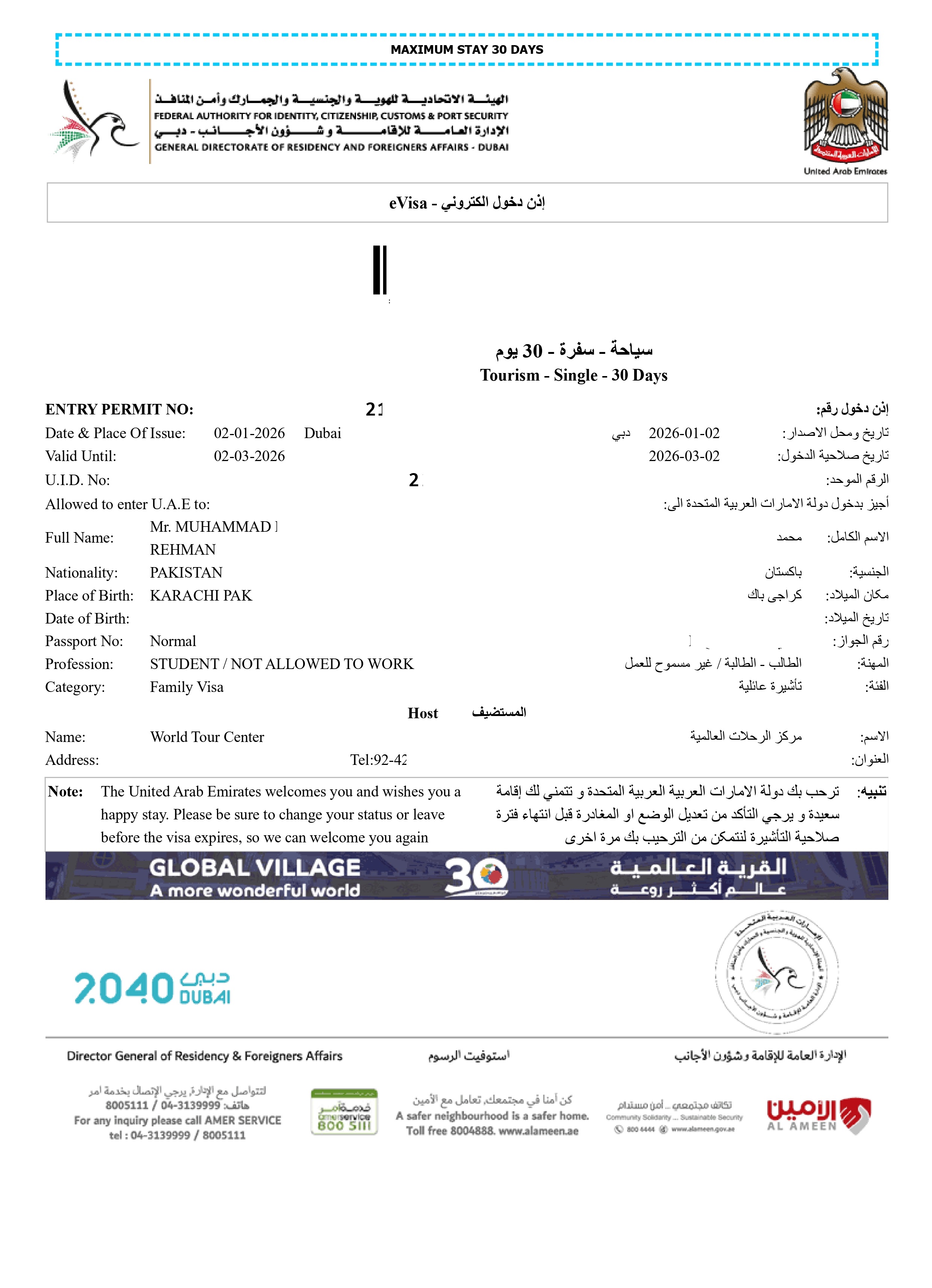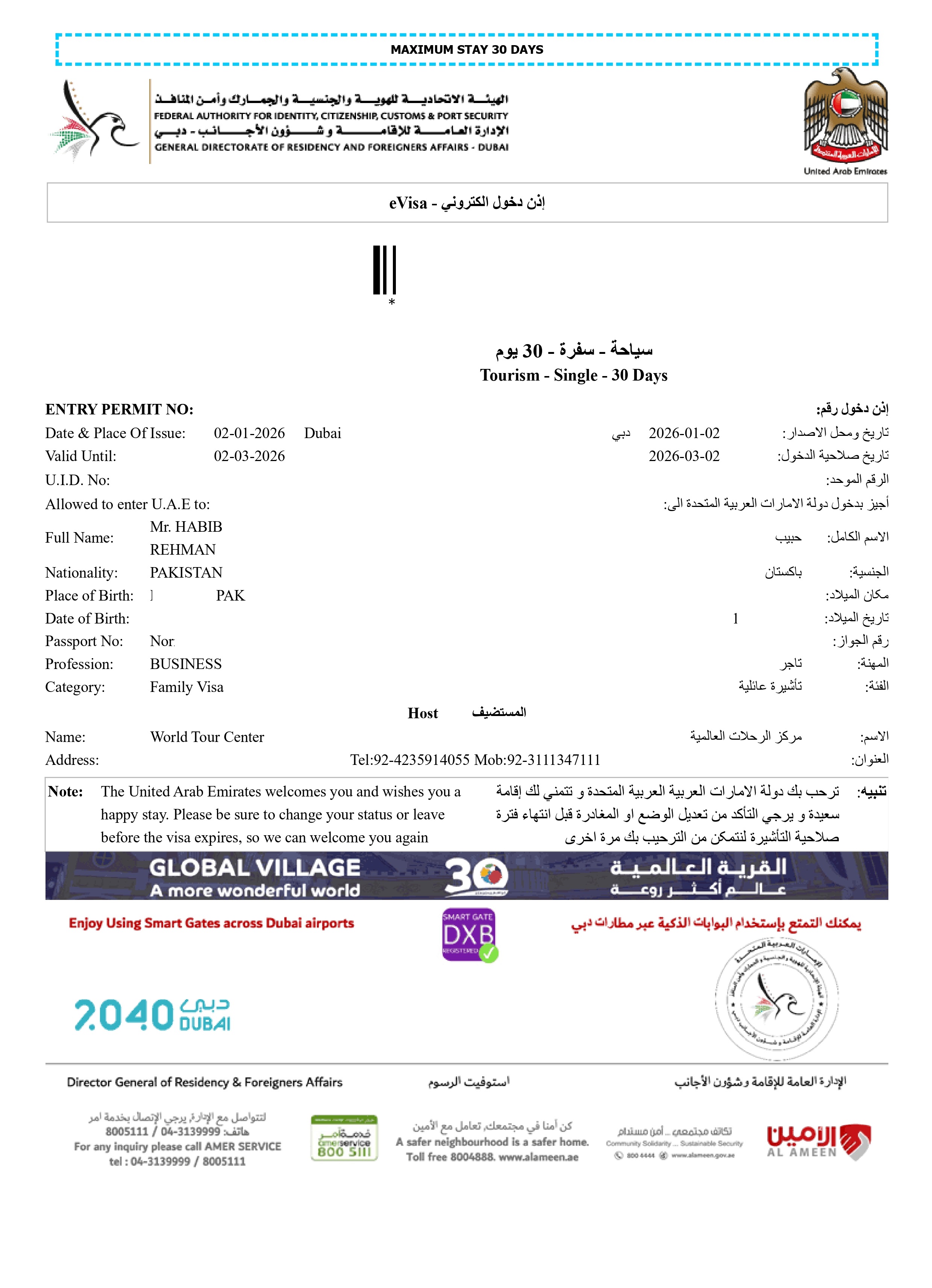 Dubai Single-Entry Tourist Visa – Valid for 30 or 60 days.