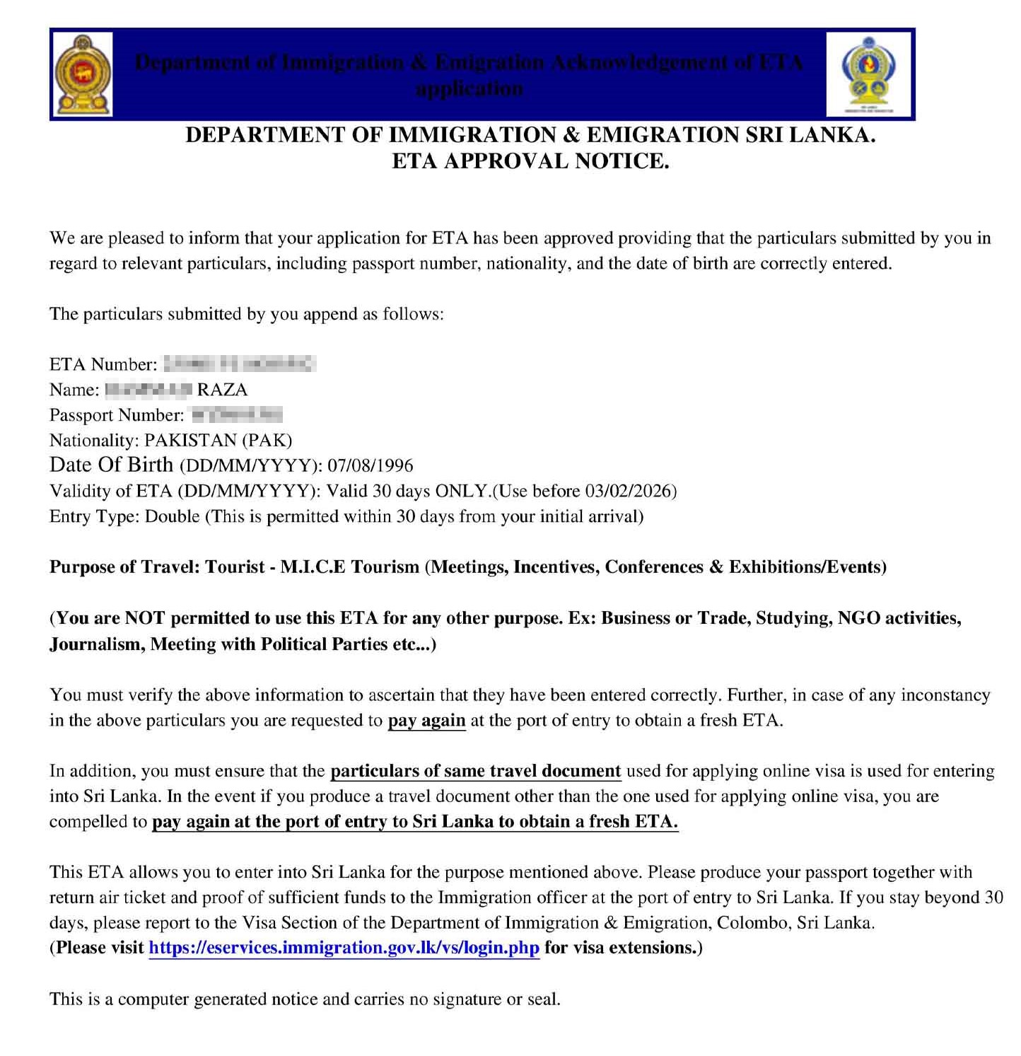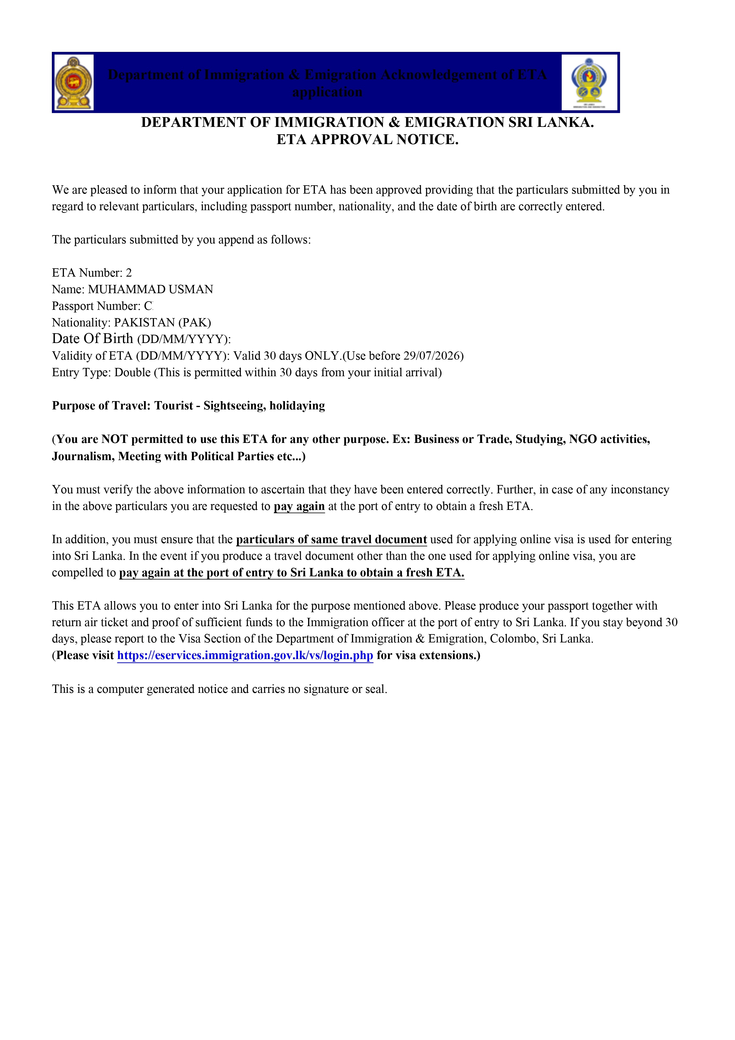 All of the travelers to Sri Lanka must have ETA in order to enter Sri Lanka. The following website can be accessed for further information: www.eta.gov.lk